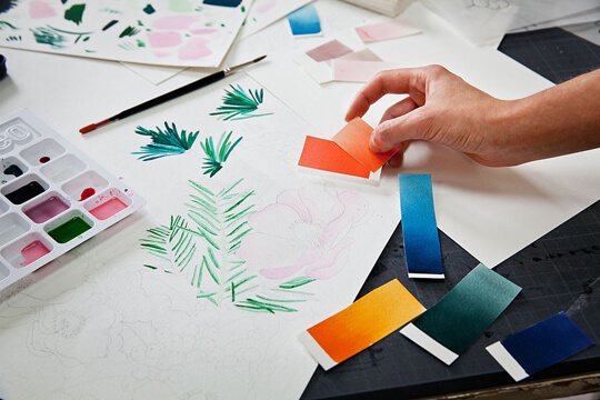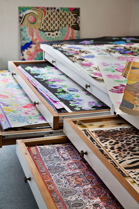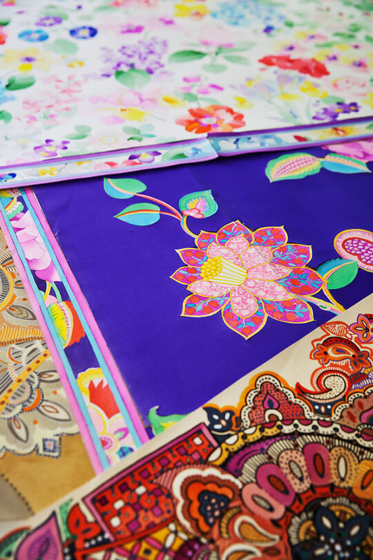 En Italie, dans les coulisses des usines de fabrication et d'impression des tissus, opère la magie de techniques uniques et de savoir-faire historiques. C’est là que sont élaborés les imprimés iconiques, sous les mains des meilleurs artisans qui travaillent l’impression au cadre, roulottent à la main, supervisent toutes les finitions…