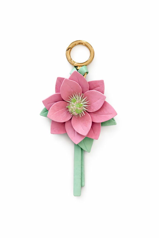 Two-tone flower charm in fresh spring colors, blending soft dusty rose with seafoam green. The perfect LEONARD accessory to take everywhere, worn as a signature detail on your bag.