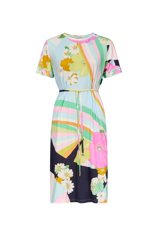 Short dress with round neckline Short sleeves with borders Removable belt Length size 36 : 100 cm 34 to 48