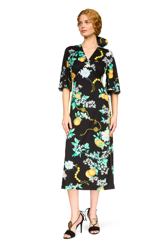 V-neck midi dress with ¾ sleeves Front cut-outs, under-bust pleats, back zip Length size 36 : 120 cm 34 to 48