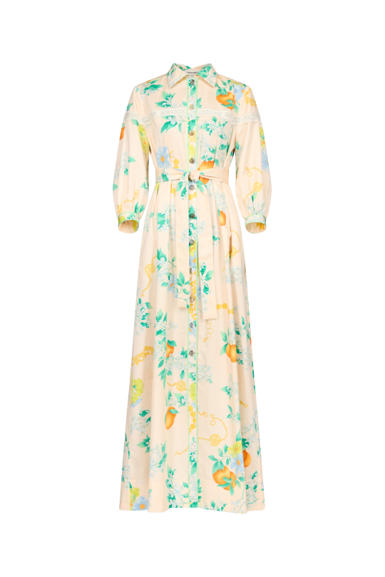 3/4 puff-sleeve long dress with a regular collar, front buttons, chest and sleeves ribbon. Removable belt Length size 36 : 150 cm / 34 to 48