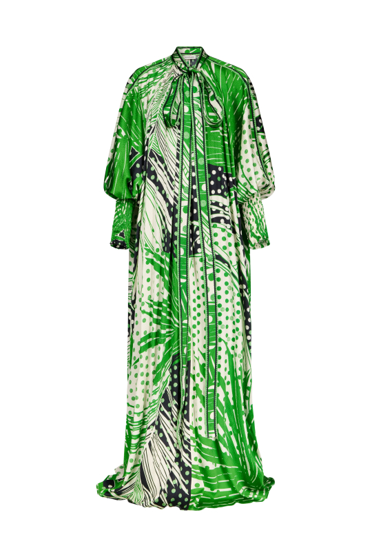 Long caftan dress with puffed sleeves, front buttons and ties.