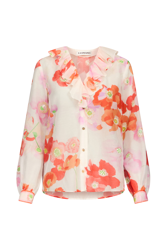 Long button-up shirt with a V-neckline, ruffled collar, and long sleeves.