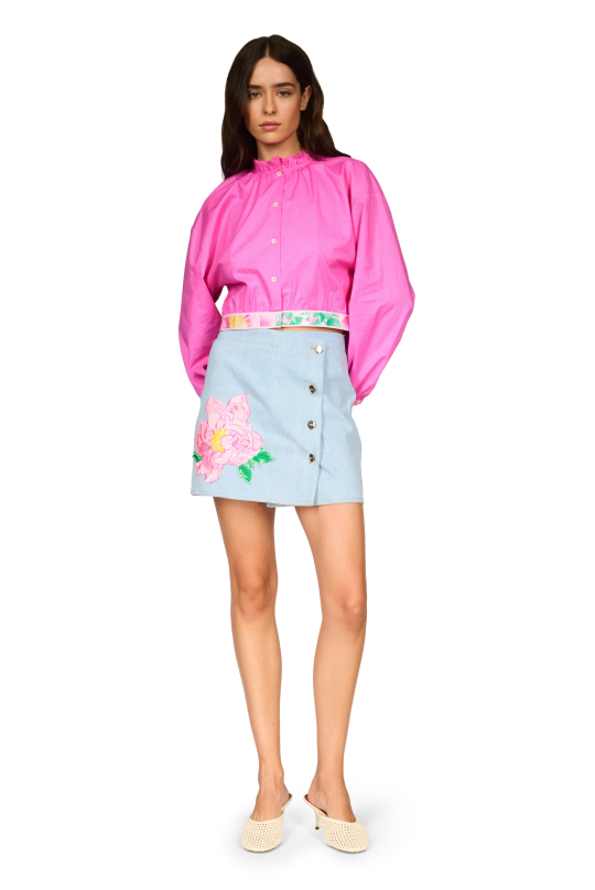 Feminine cotton poplin shirt, lightweight and soft. Features a subtle ruffled collar, long sleeves gathered at the cuffs, and a button-front closure. An elegant, bright piece that’s easy to wear both for everyday looks and more dressed-up outfits.