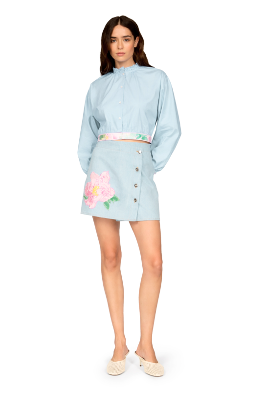 Feminine cotton poplin shirt, lightweight and soft. Features a subtle ruffled collar, long sleeves gathered at the cuffs, and a button-front closure. An elegant, bright piece that’s easy to wear both for everyday looks and more dressed-up outfits.
