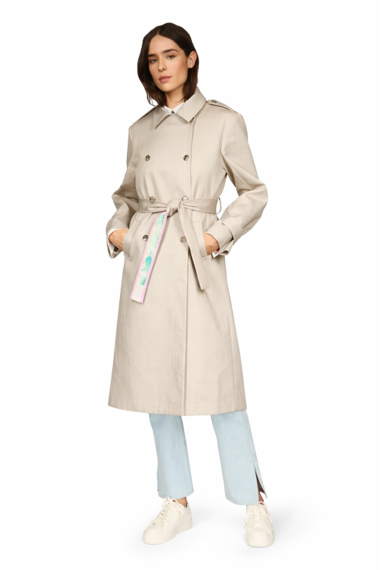 Trench-coat avec double boutonnage sur le devant, poches latérales, fente noire, ceinture amovible. Longueur taille 36 : 115 cm / 34 à 44