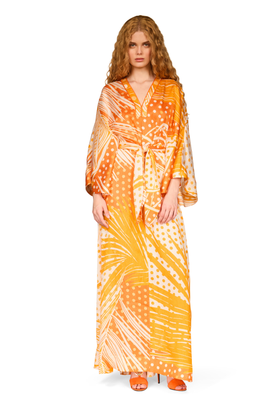 Robe longue style caftan avec manches drapées, col en V, fermeture éclair dans le dos, ceinture amovible.