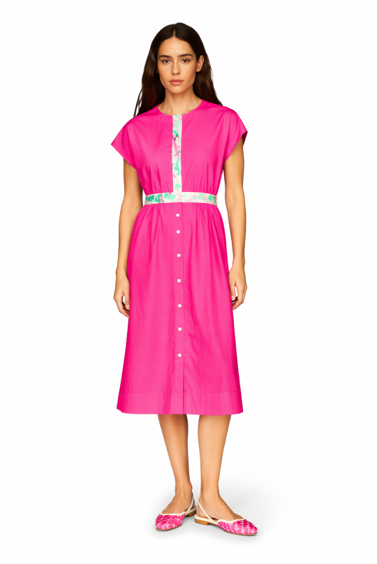 Robe midi à manches courtes, encolure ronde, taille légèrement marquée avec bande imprimée, fermeture frontale avec bouton demi-lune doré et boutons nacrés.